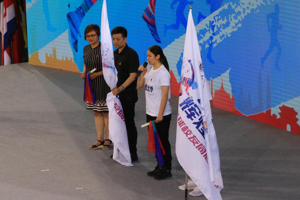 捐赠仪式后,党委副书记、副校长贾文键及众多知名校友共同启动“八十载辉煌足迹,全球校友同心接力跑”活动。我院卓悦同学作为留学生代表参与传递接力棒、接力旗环节。
