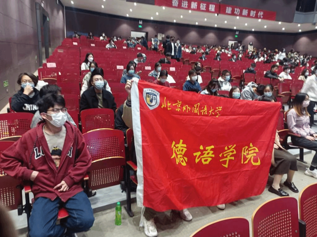 部分学生党员、团员代表在辅导员黄唯城的带领下在千人礼堂集中观看开幕会。