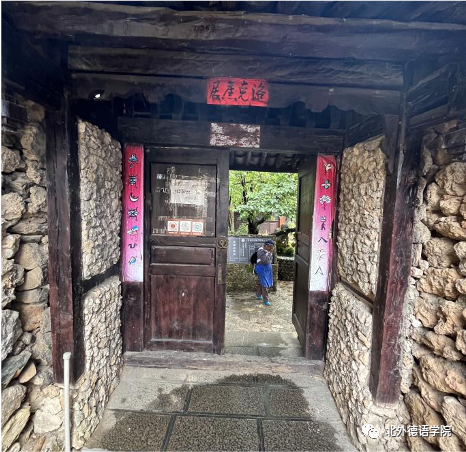 洛克故居门前用东巴文书写的对联“新年新月新气象 千花万花已出来(根据纳西族阿妈介绍音译)”让党员教师感受到了象形文字的魅力。