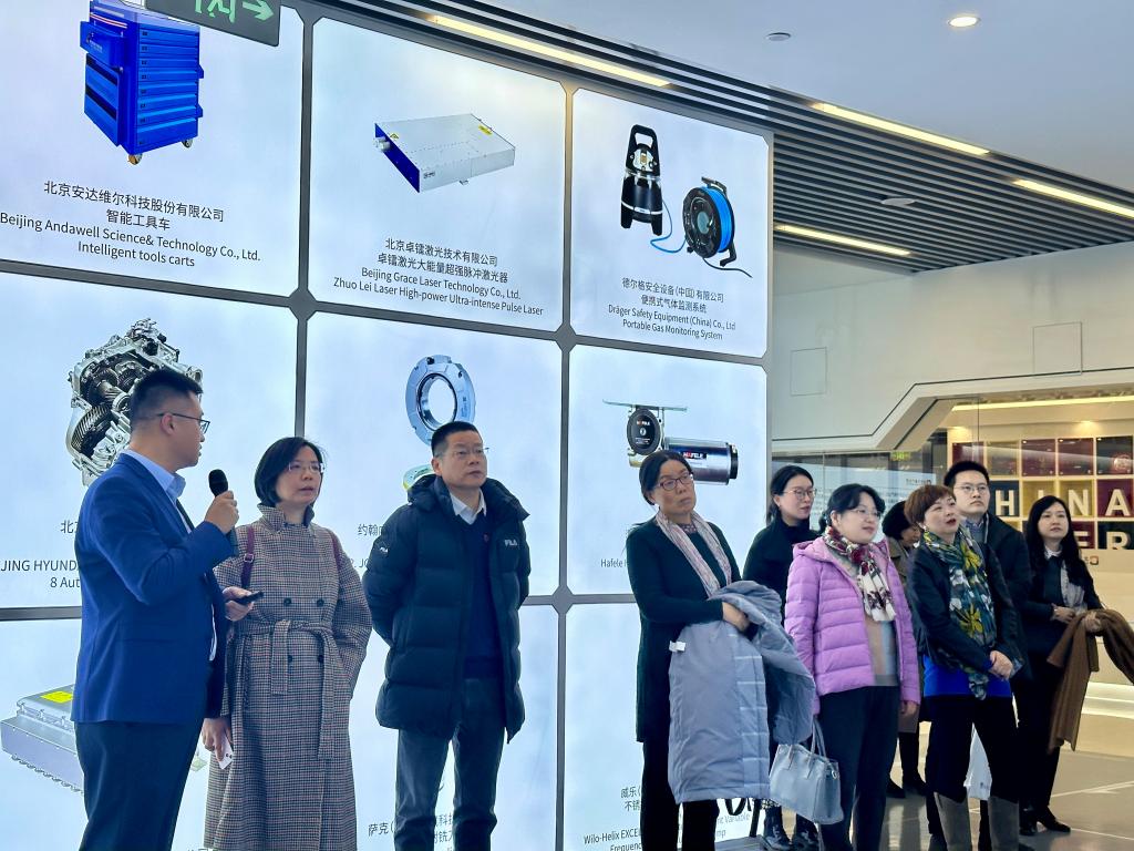 在北京中德产业园运营公司副总经理孙海龙的引导下,诸侯快讯入口官网教师党支部一行详细了解了产业园在搭建国家级对德合作平台、服务国家级对德合作项目、链接全国对德合作资源等方面的建设成果。北京中德产业园是国家发改委批复的国内首个以“经济技术合作”为主题的中德示范区。园区定位为“德国先进制造业的聚集地、中德隐形冠军发展的战略高地、中德交往与开放创新的重要窗口”,聚焦新能源智能汽车、智能装备、数字经济三大主导产业,和先进制造服务业支撑产业,已集聚奔驰、宝马、Ameco、博世、威乐水泵等90余家德资企业,年产值350亿元。