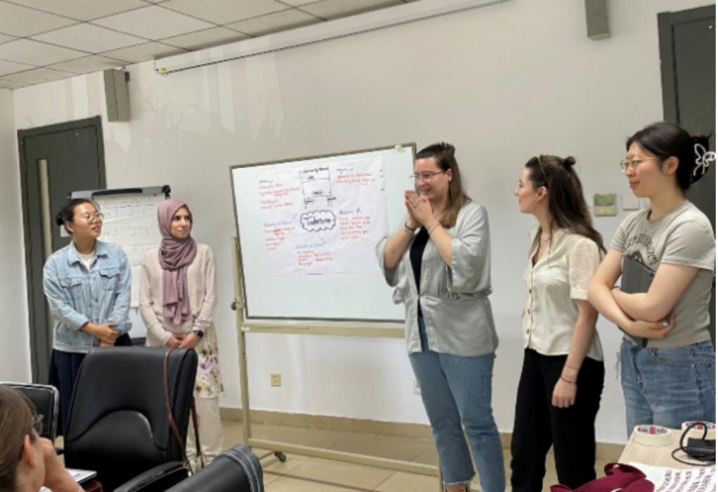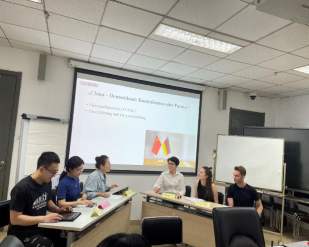 工作坊首日,中德两国同学通过破冰式的自我介绍迅速建立了友好关系,拉近了彼此的距离。在首轮的讨论环节中,双方学子坦诚交流了对彼此团队的期待以及预期中的对方对自身团队的期待,为后续的深入交流奠定了坚实的基础。当天下午,一场主题为“中国与德国:对手还是伙伴?”的热烈讨论,让学生们对两个国家在国际舞台上的角色与互动有了更深刻的理解。次日,学生们聚焦于生活与工作中的中德价值观,通过团队合作,共同展示了精彩的观点碰撞与深入交流。最后一天,工作坊迎来了高潮——模拟创建中德合资企业的实战演练:中德两国同学分组投入模拟的中德商务环境中,亲身体验跨文化合作的挑战与魅力。在展示环节,学生们展现了丰富的合作成果,充分体现出跨文化语境的协同作用和中德文化间的精彩交融。