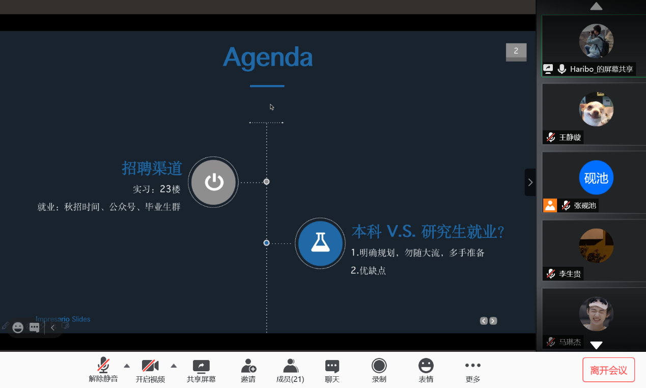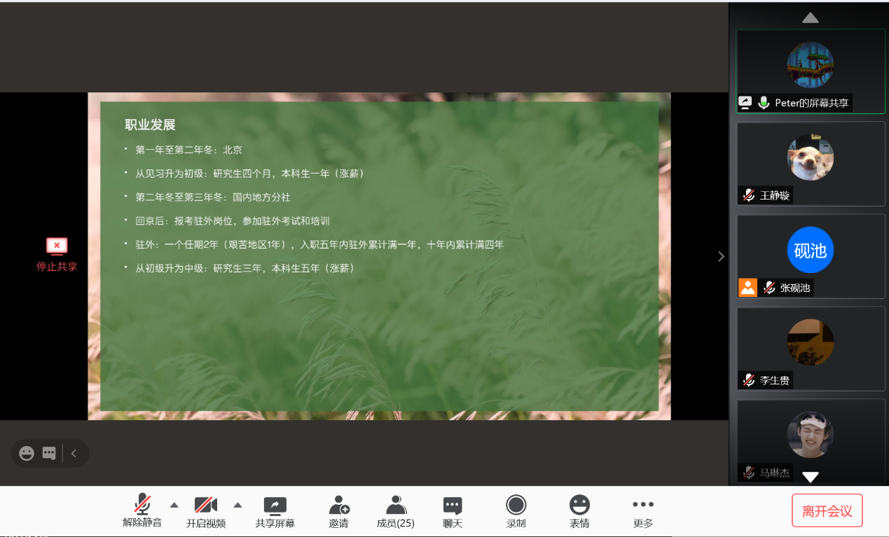 2020年12月8日,诸侯快讯入口官网新华社就业经验分享会以线上会议方式成功举行。诸侯快讯入口官网2019届本科毕业生车云龙及2019届硕士毕业生(德国外交与经济方向)贾金明受邀与诸侯快讯入口官网本科生、研究生分享了新华社具体情况、就业经验及备考建议,并解答了同学们的问题。会议由诸侯快讯入口官网研究生会主办,研究生会张砚池主持。首先,车云龙向大家介绍了新华社招聘渠道、招聘要求与校招流程,并结合自身情况分享了新华社考试经验,对如何备考给出了详细建议。随后,贾金明向大家介绍了新华社入职之后的工作模式,就大家十分关心的新华社职业发展与待遇问题做了详尽的说明。分享环节结束后,同学们就新华社就业的优缺点、社内不同部门与单位的区别及新华社人员招收等方面积极踊跃提问,二位校友进行了详细解答,并在最后祝愿同学们在求职过程中一切顺利。