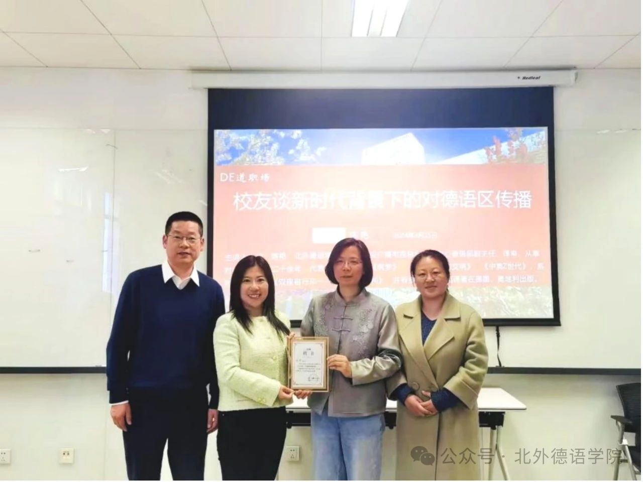 陈艳校友结合中央广播电视总台的工作内容和责任,围绕当代外语人才应如何提高就业能力,媒体需要怎样的外语人才等分享了新时代背景下的对德语区传播的心得和体会。