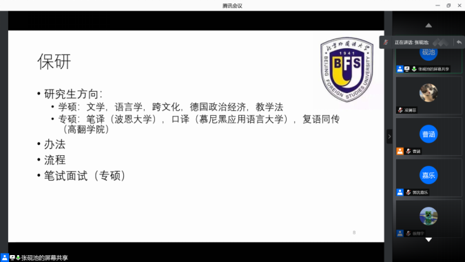最后, 2019级硕士研究生张砚池同学分享了在哥廷根留学的经历和宝贵经验,并为同学们展示了大三大四时的选课情况以及保研方向。此外,她还提出了“多与学长学姐交流获取信息”、“学好专业课的同时探索自己的深造或职业发展方向”、“学会利用学校和学院提供的资源”以及“灵活应变”四条建议。