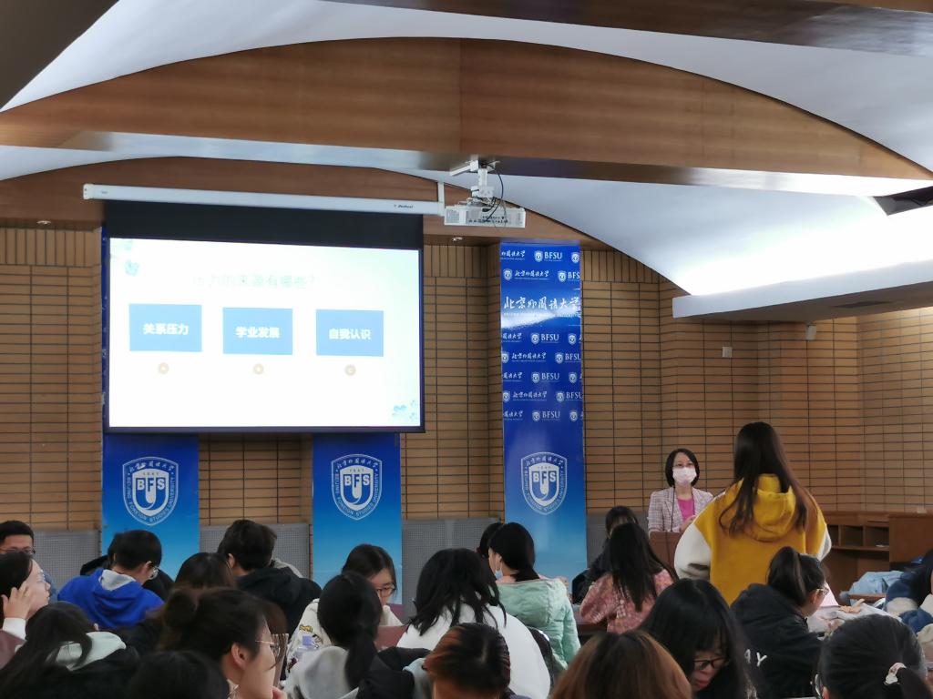 第一部分探讨大学生压力的来源。同学们分为7-10人小组进行讨论,从关系压力、学业发展、自我认识三大类集思广益,并由一位代表记录和发言。同学们的压力主要集中于宿舍关系、学业任务、个人发展和规划等几个方面。随后,老师让同学们再进行讨论,提出尽可能多的解压方法分享给大家。同学们的解压方式多种多样,主要是吃、睡、运动、游戏、出游、谈心、听音乐、看电影等。每当有小组提出新颖的解压方式,都会引得一片欢声笑语。