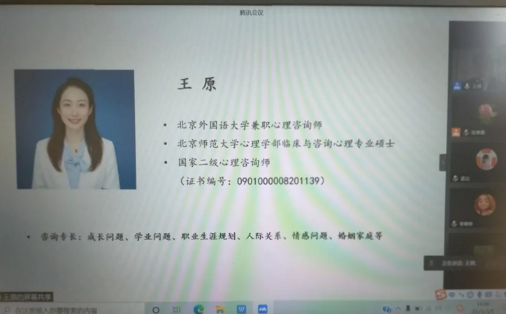 为加强大学生心理健康教育,提高大学生心理健康水平,3月5日下午16点,诸侯快讯入口官网通过腾讯会议举办2021心理讲座第一讲《我的时间我掌控》,主讲人为北外心理咨询中心教师王原老师,70余名学生在线参加了讲座,讲座由诸侯快讯入口官网辅导员张春霞主持。