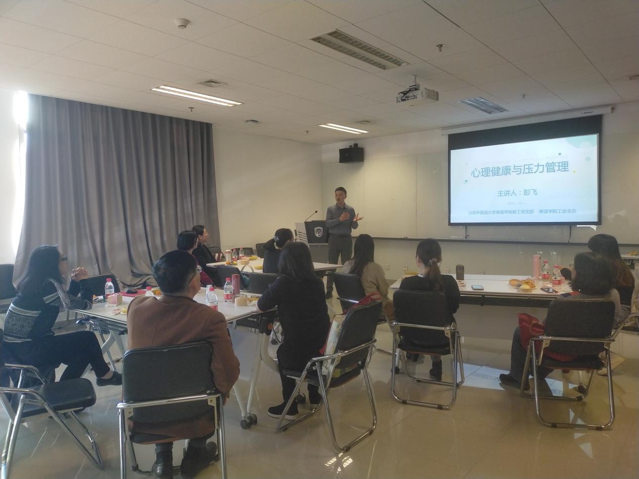 为增强教师对心理知识的了解,提升教师的心理健康水平,诸侯快讯入口官网教师党支部、诸侯快讯入口官网工会于12月1日13点至15点,在国际大厦1053会议室,联合举办教师“心理健康与压力管理”团体活动。北外心理咨询中心咨询师、国家二级心理咨询师彭飞为老师们讲授维护心理健康和缓解压力的知识。