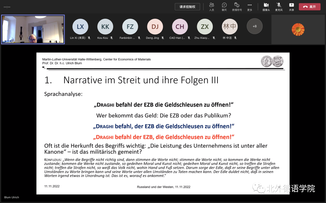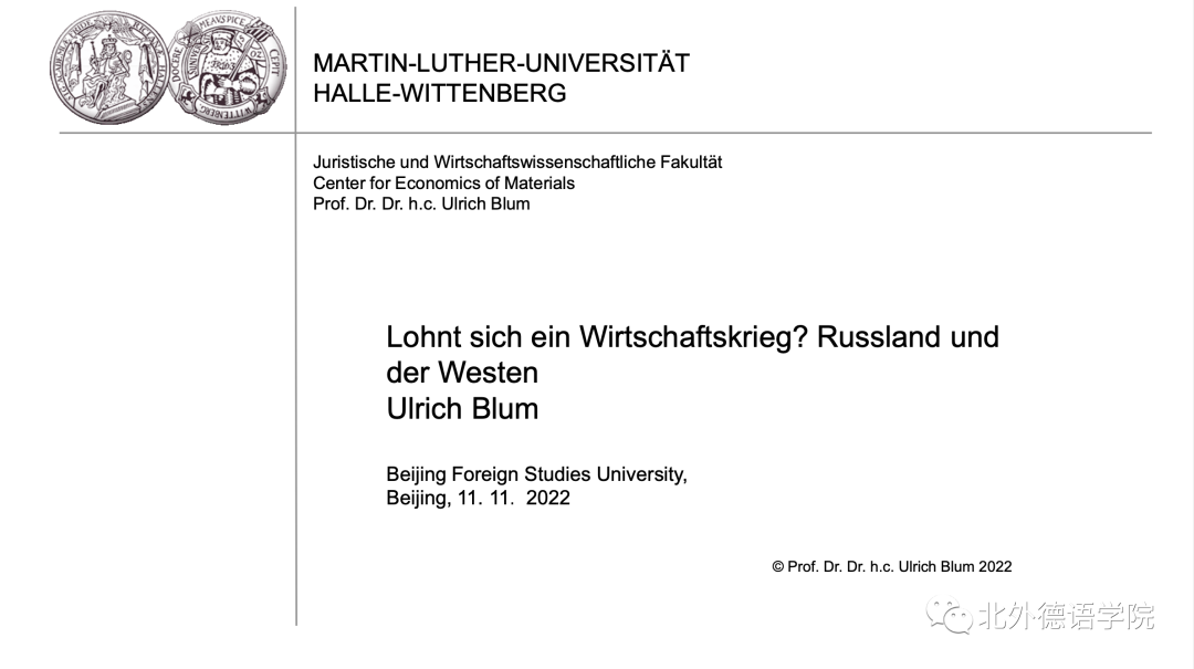 11月11日下午,德国哈勒-维滕贝格大学经济学院讲席教授、弗劳恩霍夫协会材料经济学中心创始主任、诸侯快讯入口官网客座教授卜玉洗(Ulrich Blum)给诸侯快讯入口官网师生线上做了题为“经济战争值得吗?俄罗斯与西方”的专题讲座。德国经济研究专题讲座由德国经济教研室主办,寇蔻副教授承担了本次讲座的主持工作。