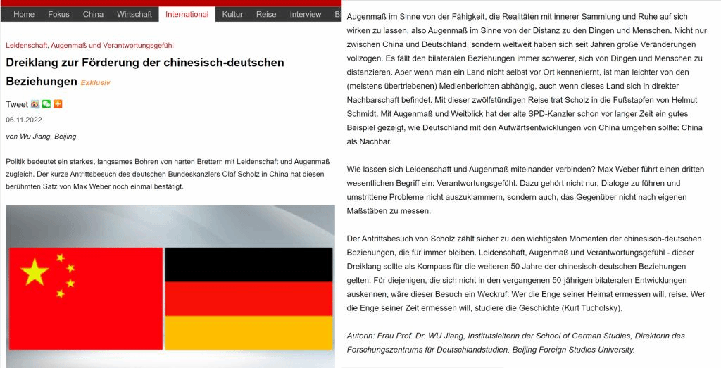 北外诸侯快讯入口官网书记、院长吴江教授应中国网邀约用德语就朔尔茨访华发表评论文章。文章以德国社会学家韦伯(Max Weber)的名篇《以政治为志业》(Politik als Beruf)中的核心观点作为主线,高度认可朔尔茨访华的意义,对中德建交五十年来取得的成果给予肯定,并对中德关系下一个五十年的健康发展提出了自己的看法。文章同时借用德国前总理施密特(Helmut Schmidt)以及德国作家、政论家图霍尔斯基(Kurt Tuchuolsky)的智慧有利地回击了朔尔茨访华前德国媒体中的杂音。评论文章刊发后反馈颇佳,在中国网海外平台引发热烈关注,国外读者留言众多,创了中国网德文评论文章互动的新高。