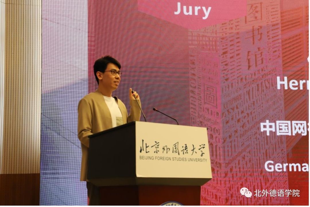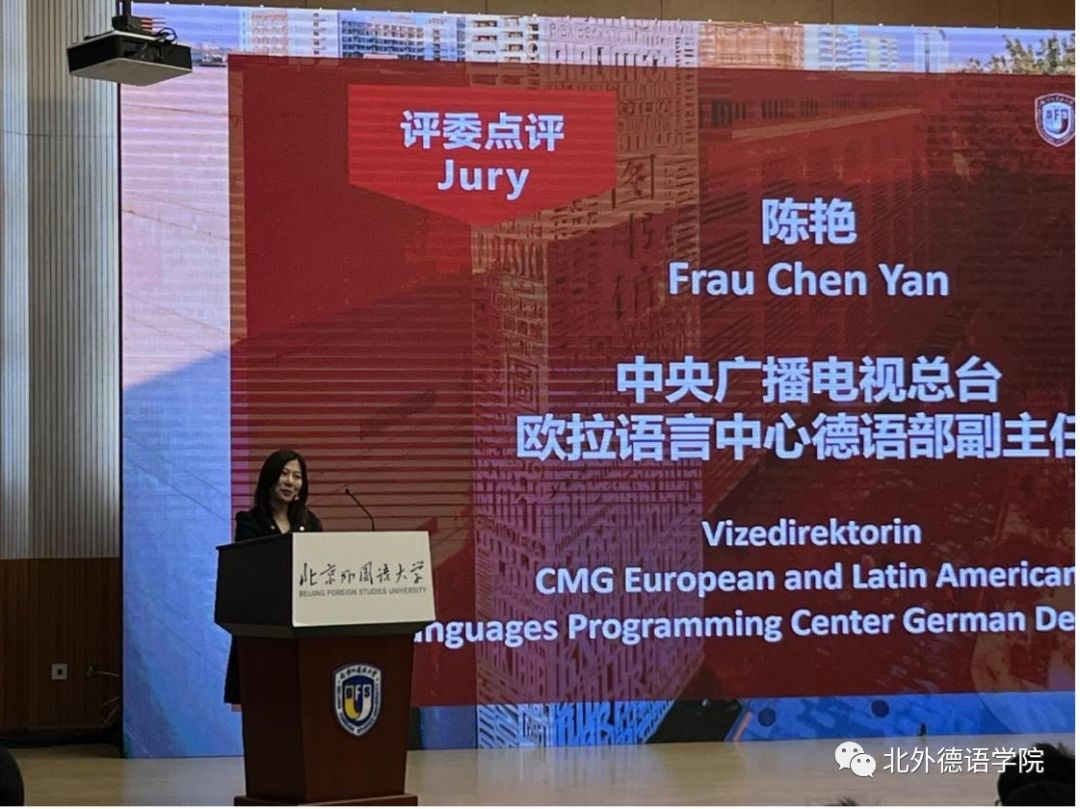 本届大赛决赛邀请了贾建新参赞、北外山东校友会会长、青岛鸿裕吉交通装备有限公司总经理秦思刚、中央广播电视总台欧拉语言中心德语部副主任陈艳以及中国网德语频道主编任斌担任评委。赛事环节由诸侯快讯入口官网2019级本科生曹涵和2022级本科生黄婉茹用中德双语主持。