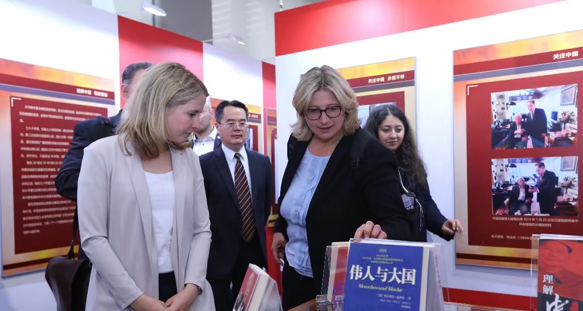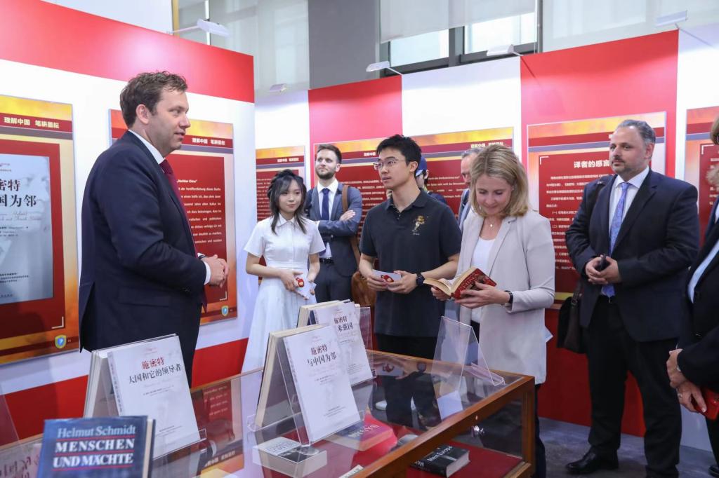 施密特一生撰写了多部以中国为主题或与中国相关的论著,许多著作的中译本都凝聚了北外校友的心血,例如中国前驻德国大使梅兆荣先生领衔翻译的《与中国为邻》(Nachbar China)、《伟人与大国》(Menschen und Mächte)以及已故北外诸侯快讯入口官网教授刘芳本老师领衔翻译的《行动起来 为了德国》(Handeln für Deutschland)等。展板的第四板块“理解中国 笔耕墨耘”展出了施密特经典著作的德文版以及中译本。克林贝尔在得知诸侯快讯入口官网图书馆藏有诸多施密特著作及中译本后表示非常感动。代表团全体成员在书籍前停下脚步,认真翻阅,并对北外德语学科点在人才培养领域做出的杰出贡献表示赞赏。