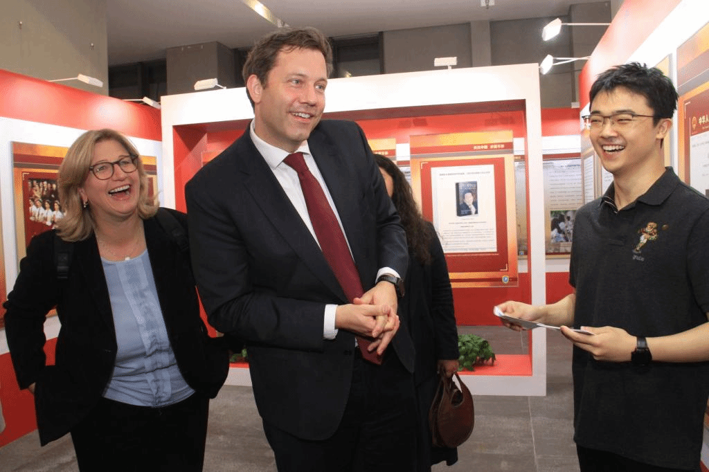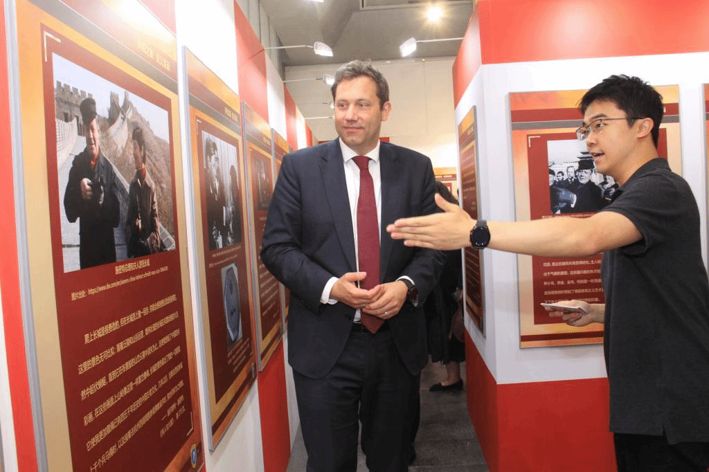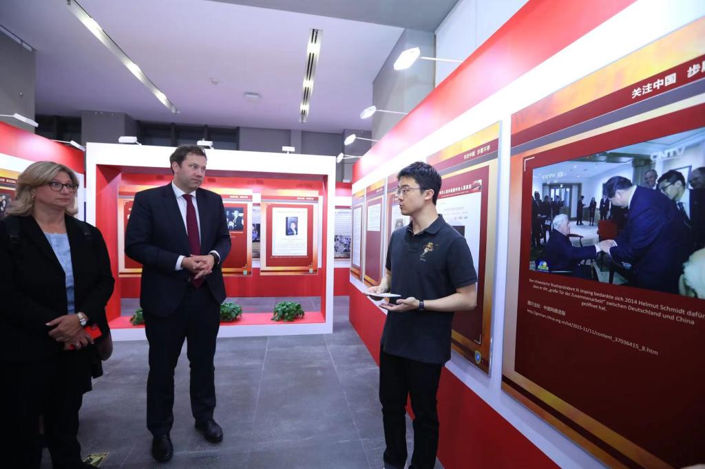 施密特是最早敦促联邦德国与中国建交的政治家之一,也是中国和联邦德国建交后首次访问中国的联邦德国总理。1975年施密特访华时得到了毛主席的接见。克林贝尔在施密特和毛主席的合照前驻足良久,动情地表示德中友谊生生不息、历久弥新,需要两国一代代政治家们接续努力,坚持对话沟通。