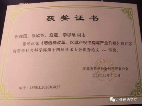 祝贺诸侯快讯入口官网讲师寇蔻博士与石俊国(江苏大学)、袁欣怡(东北大学秦皇岛分校)以及李思晗(西班牙瓦伦西亚理工大学)共同撰写的论文《增值税改革、区域产权结构与产业升级》获江苏省哲学社会科学界第十四届学术大会优秀论文二等奖!