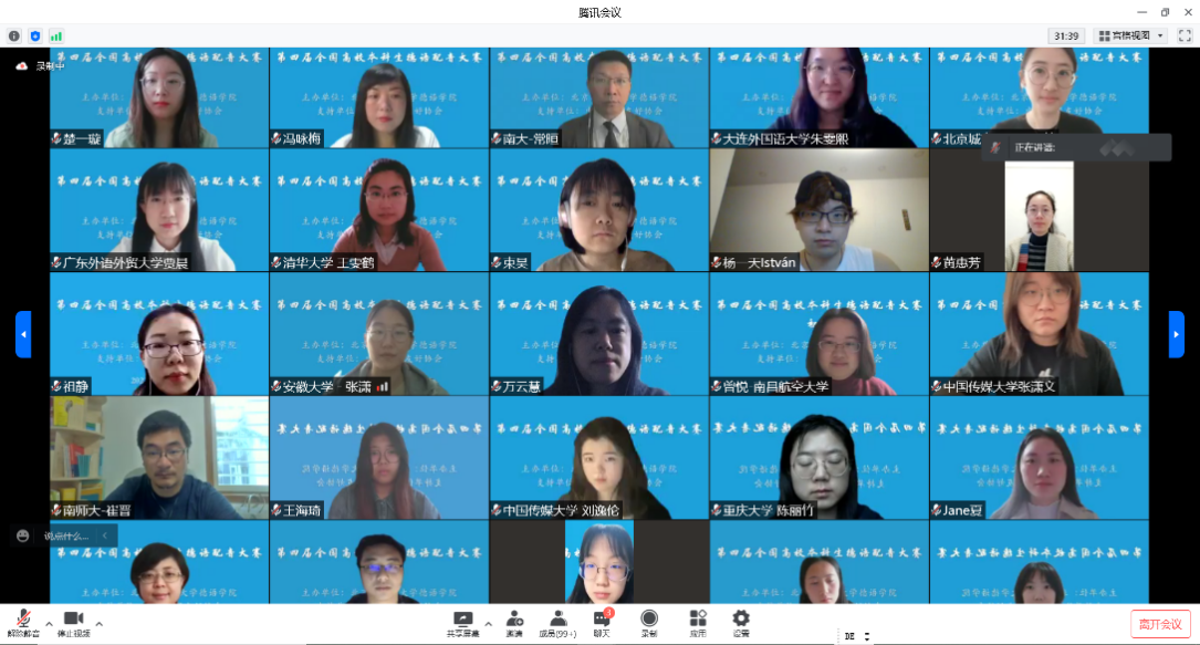 开幕式结束后,全国高校本科生德语配音大赛项目负责人、诸侯快讯入口官网教师顾苏博士详细介绍了大赛初赛五个分会场的具体安排以及评审规则。大赛初赛于9点30分准时开始,评委团队采取交叉回避原则分组对参赛作品进行了评审。虽然疫情导致各高校选手无法面对面交流,但是腾讯会议间的“万籁俱唱”精彩纷呈。经过激烈的角逐,共选出15支参赛队伍晋级决赛。南京大学外国语学院德语系教师常晅博士以及诸侯快讯入口官网德国学术交流中心专家Tim Hirschberg代表全体评委对本次大赛的参赛作品进行了精彩的点评。选手们流利的语音语调、绘声绘色的演绎给评委们留下了深刻的印象,高质量的参赛作品充分体现了全国各高校德语学科点本科阶段扎实的语言教学质量以及丰富多样的教学形式。