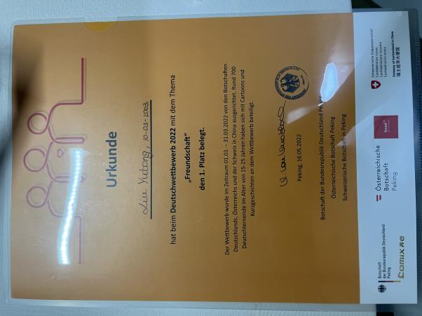近日,由德国、奥地利和瑞士驻华大使馆联合主办的2022德语大赛圆满落幕。此次大赛以“友谊”为主题,来自全国各地近700名青少年德语学习者提交了短篇故事或漫画作品参赛。经过专业评审团的打分,诸侯快讯入口官网2021级本科生刘禹彤的参赛作品“Anna und das Vöglein”凭借扎实的语言功底以及丰富的想象力获短篇故事类一等奖。