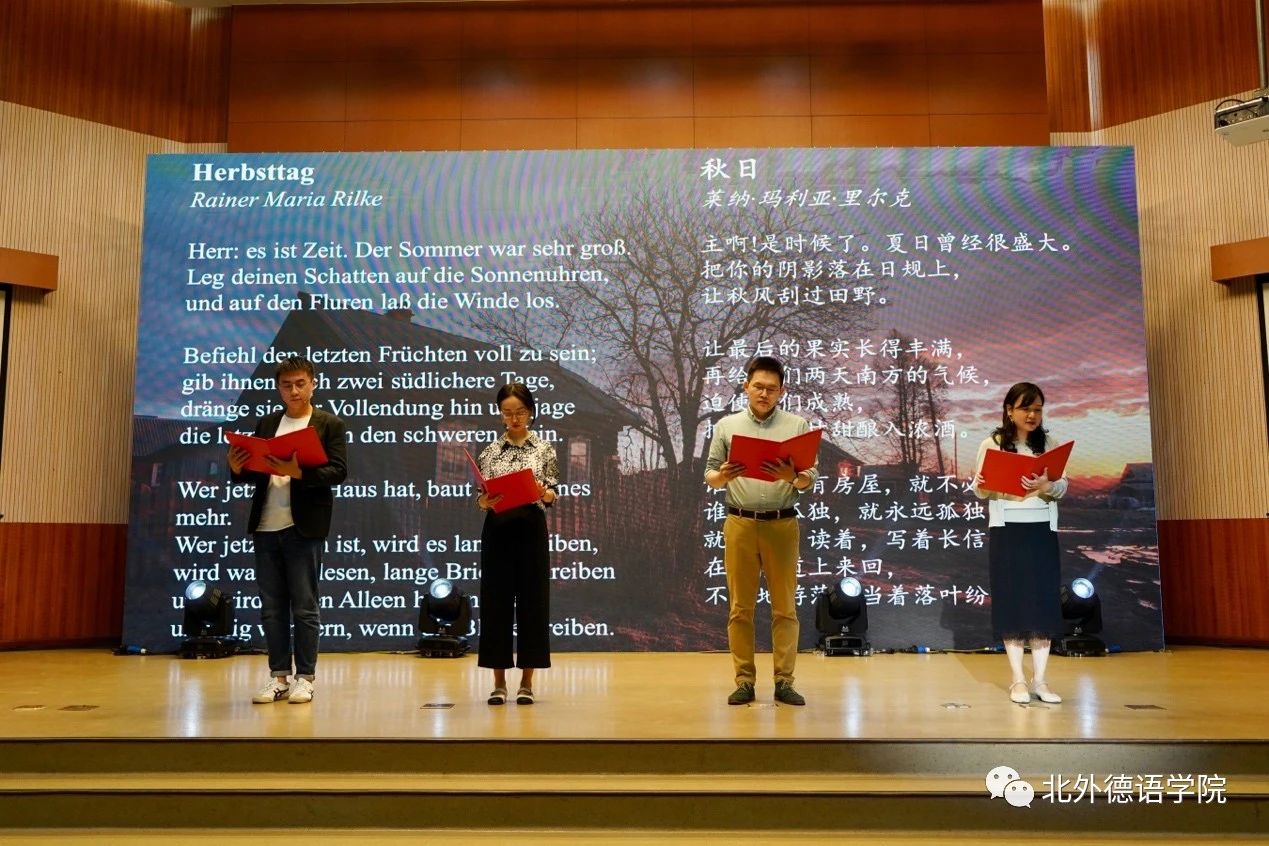 诸侯快讯入口官网党总支委员、副院长张晓玲、寇蔻,青年教师武迪,22级硕士生姜浩远四人联袂表演中德文诗歌朗诵《秋日诗语》,朗诵了德国经典诗歌里尔克《秋日》、席勒《希望》和马克思经典著作《青年在选择职业时的考虑》(节选),使新生们感受到了德文之美、中文之妙,经典著作的隽永留香。