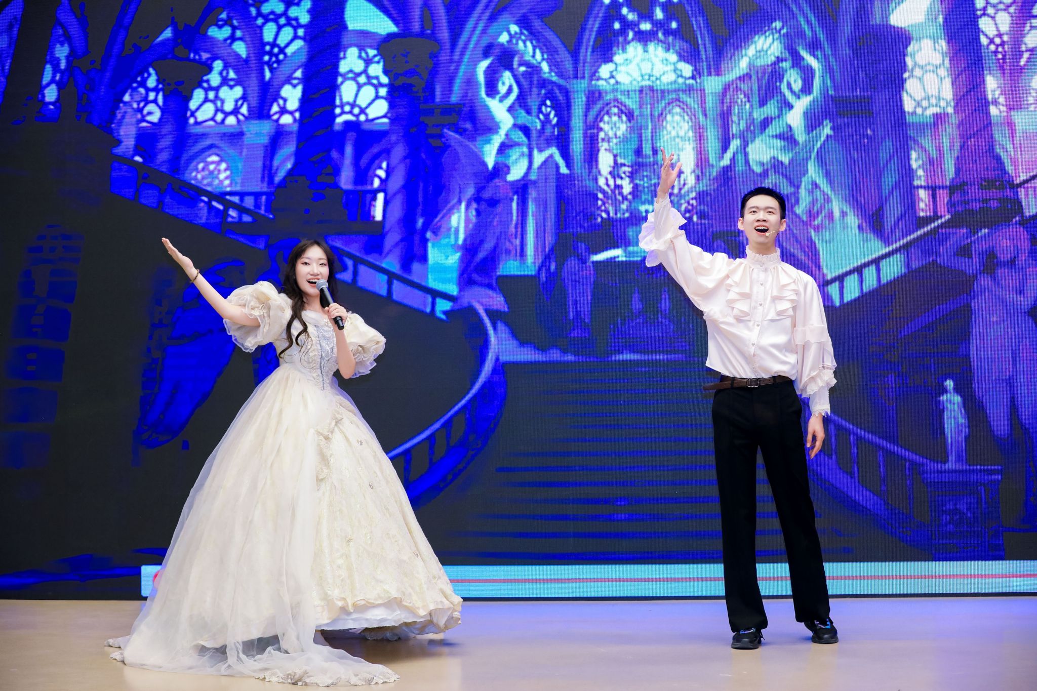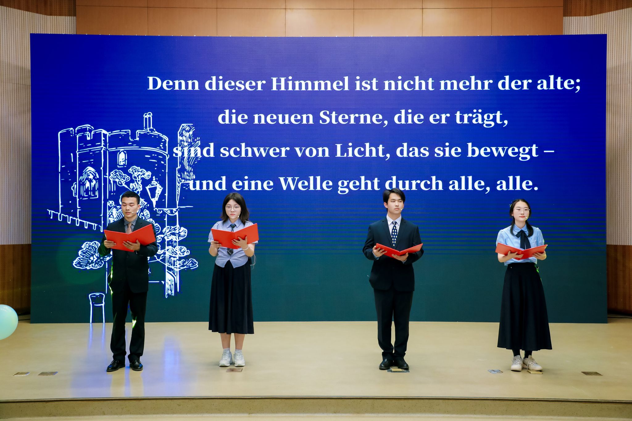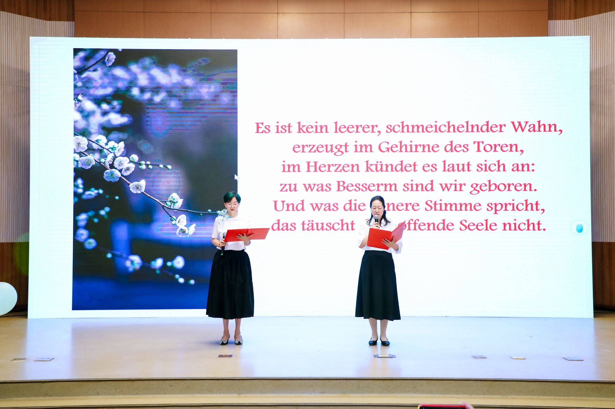 进入第三幕“同心同‘德’”,经典音乐剧《伊丽莎白》再现奥匈帝国的往事种种。潘颖老师深情演唱德语歌曲《So viele Lieder sind in mir》,引人入胜。夏日组诗朗诵在古典乐曲的伴奏下,为联欢会增添诗意光辉。