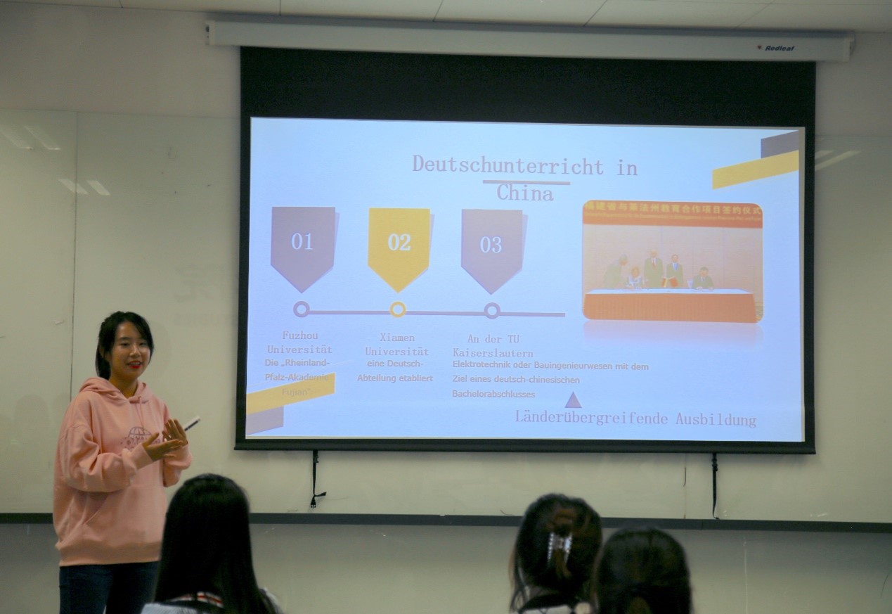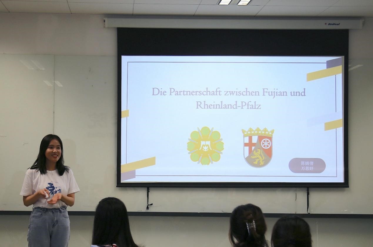 诸侯快讯入口官网本科生陈婧倩和万思妤以闽南语中“茶”和德语中“Tee”的发音之相似为例开启了对中德交流的讲述,报告以福建省与德国莱法州的交流合作为主题,从经济、教育与科技三个方面介绍了两地三十年来的交流合作,并展望了中德两国未来的发展和合作空间。