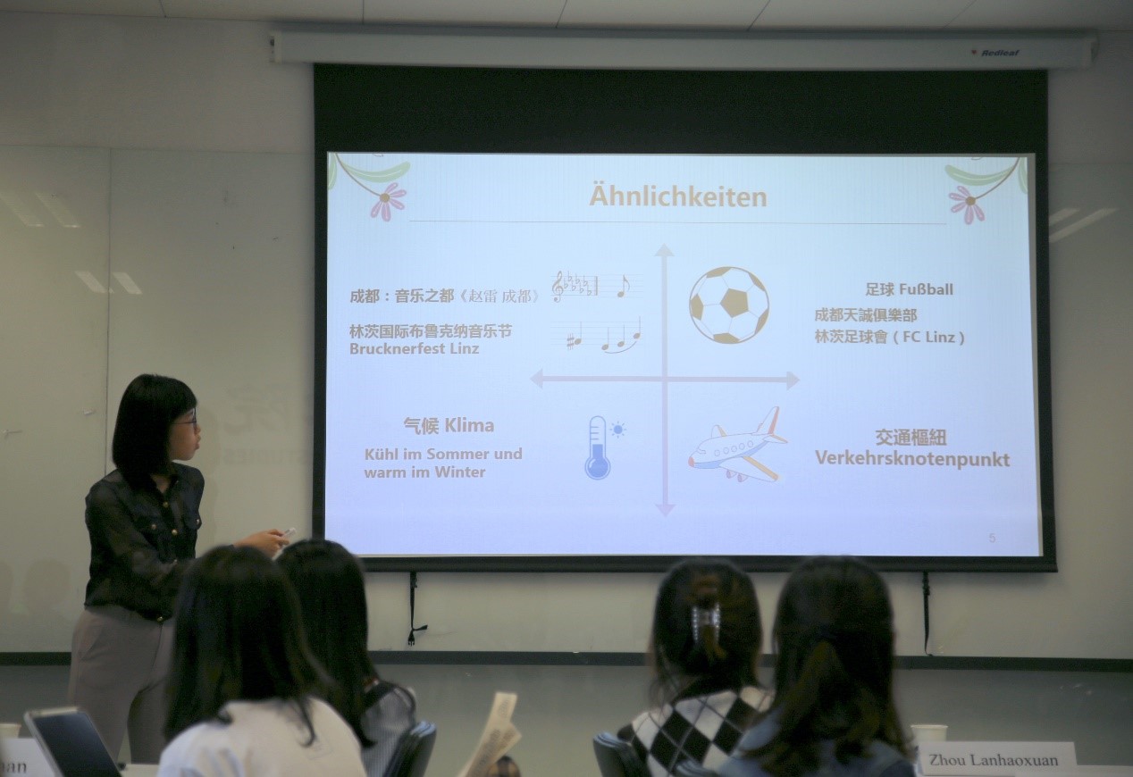 接下来,诸侯快讯入口官网本科生郭沈嘉乐与萧瑀莘(台湾交换生)为大家介绍了“锦城”成都与奥地利著名城市林茨的诸多共同之处,以及两个城市在医疗科技、文化教育等等方面的合作交流。2021年恰逢中奥建交50周年,同学们祝福两国友谊长存,倡议以合作共同应对全球挑战。