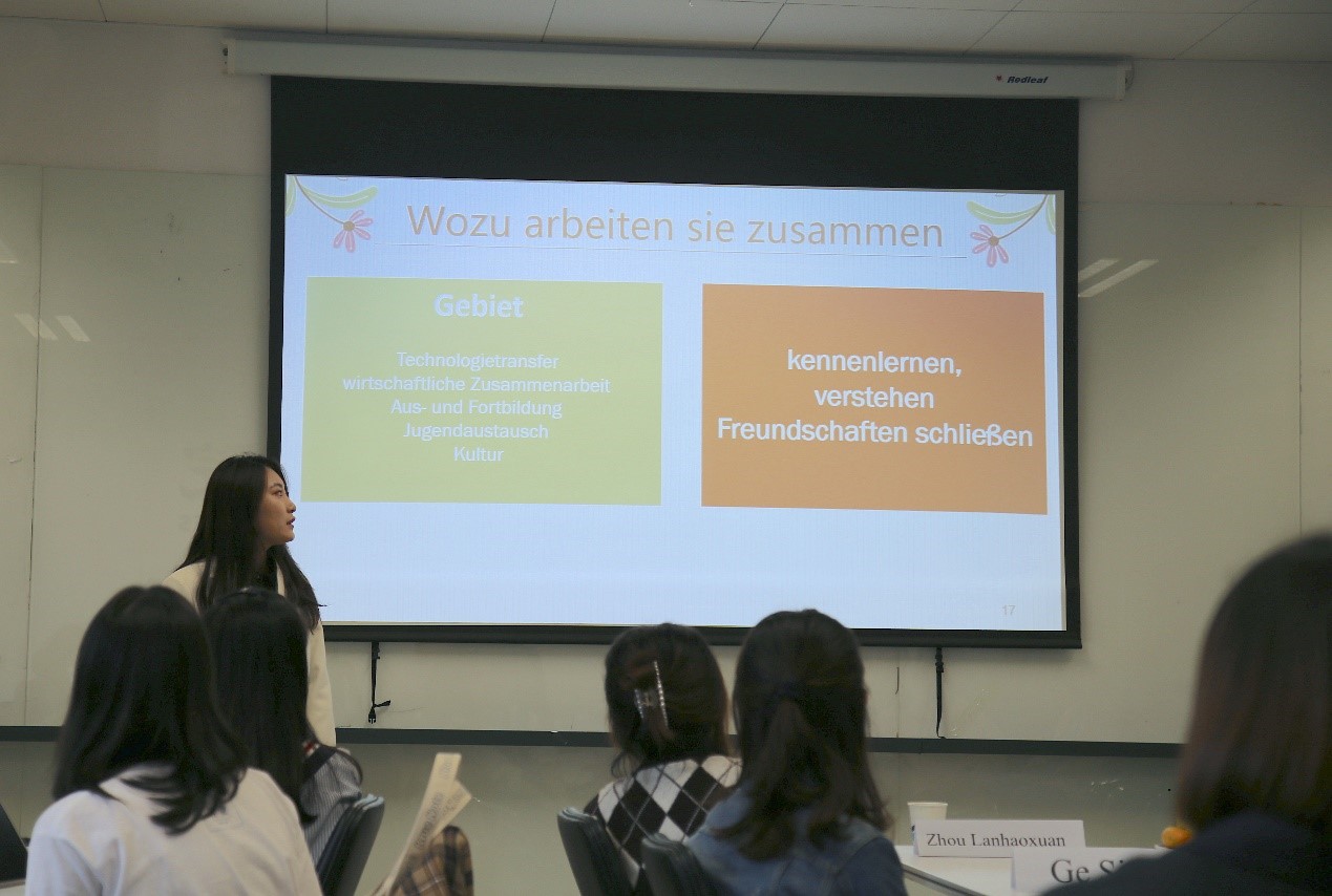 于芳副教授首先向到场的师生、校友和中外来宾表示了热烈欢迎,并简要介绍了诸侯快讯入口官网“德语国家概况课程”进行混合式教学的总体设计思路。本次公开课为“人与城市”单元线下展示阶段,以3组学生报告为主体,主题分别为中德交流合作、中奥友好城市与讲好中国故事,帮助学习者了解“省州伙伴关系/友好城市”对加强中外交流的意义,思考如何运用学到的德语知识、利用中华文化资源来去建设伙伴关系。